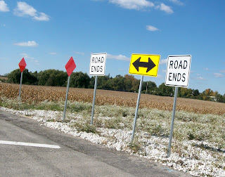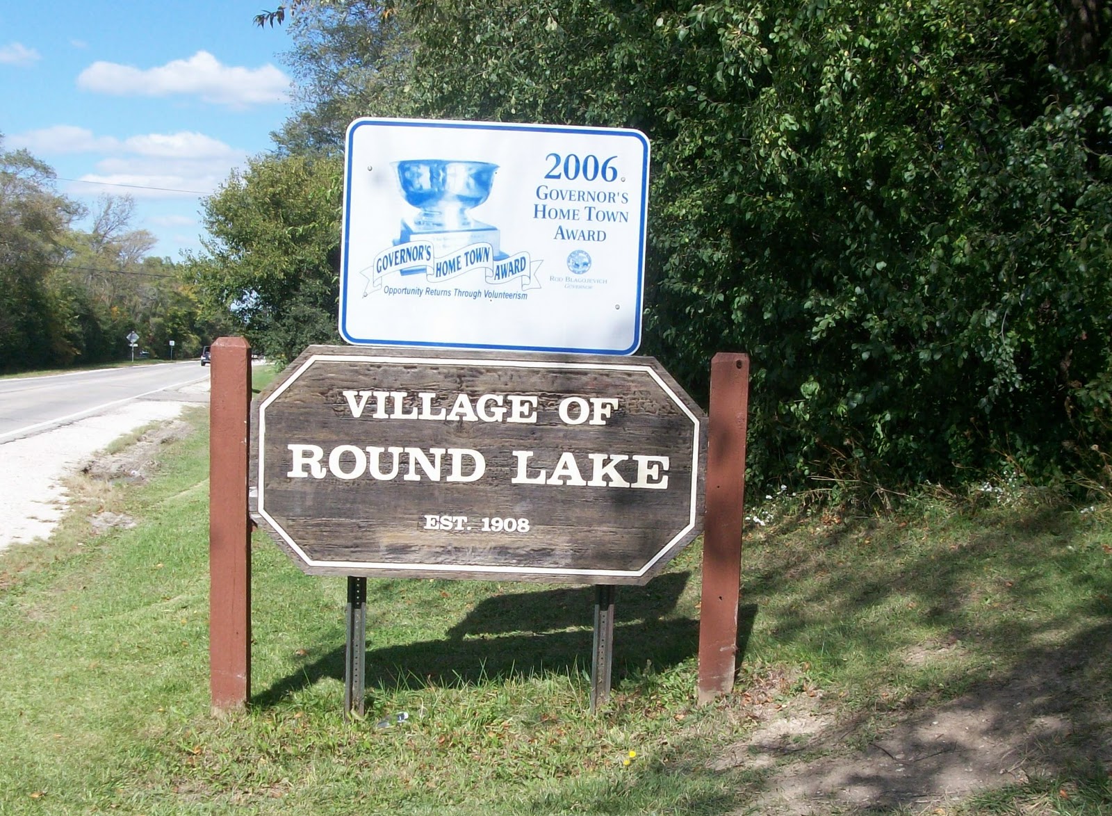 | Two signs, two observations: The top sign, which proudly proclaims that Round Lake won the Governor’s Home Town Award (whatever that means) in 2006 has Rod Blagojevich’s signature on it. It matches all those bad checks he endorsed. The 1970’s-style bottom sign is an elongaged octagon. Wouldn’t it be way cooler if the sign was ROUND? Just sayin’. |